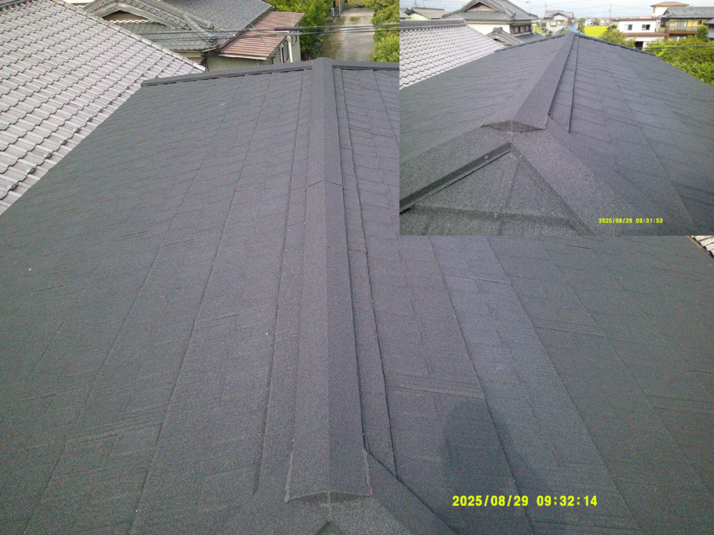 上がってみると、屋根材の塗装劣化が進んでいる事と、屋根材の割れも多く発生していたので、対策時期と判断し下記のカバー工法をお勧めしご採用いただきました。