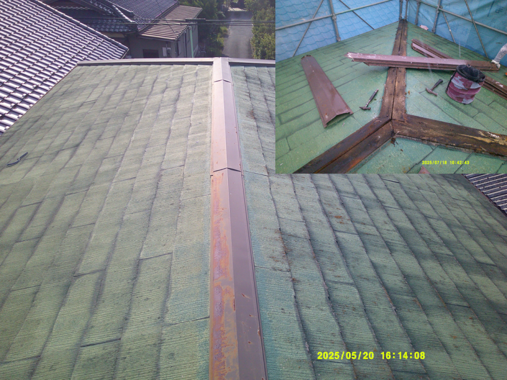 工事が始まり錆びていた棟の板金を外してみると、中の木下地がボロボロに腐っていました。これでは今後の台風などで板金が飛ばされていたかもしれません。